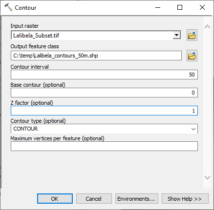 Once you start the contour tool, you will have a few different settings to fill in. The Input Raster should be your subset DEM, the output is a new file you will store the vector contour lines in. The Contour Interval is how far apart your contour lines will be. Here, my sample area is pretty mountainous, so I have chosen 50 m. You can look at the range of values in your DEM and decide from there.